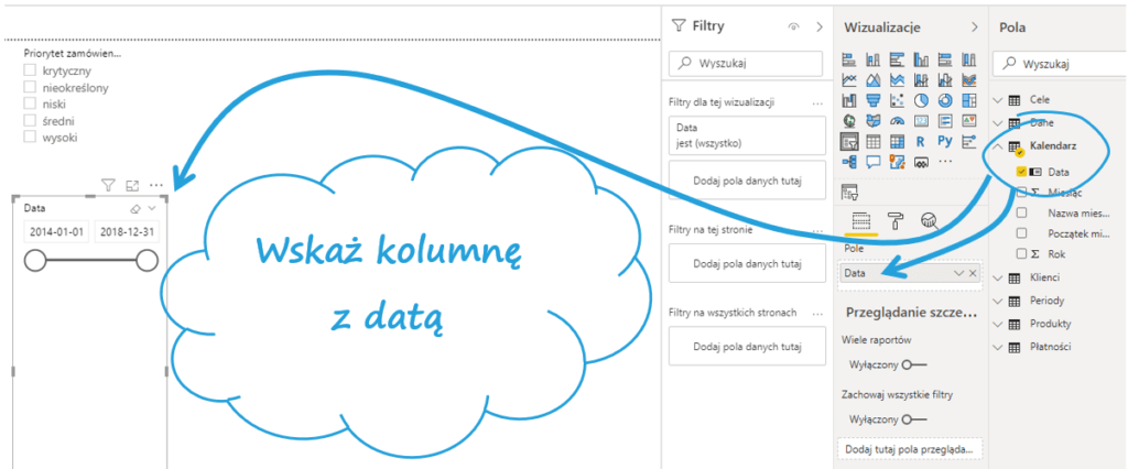 Gdy zaznaczony jest element fragmentatora, w panelu Wizualizacje pojawia się półka Pole – wybierz z danych kolumny oznaczające czas. Fragmentator od razu pokaże zakres dat w danych.