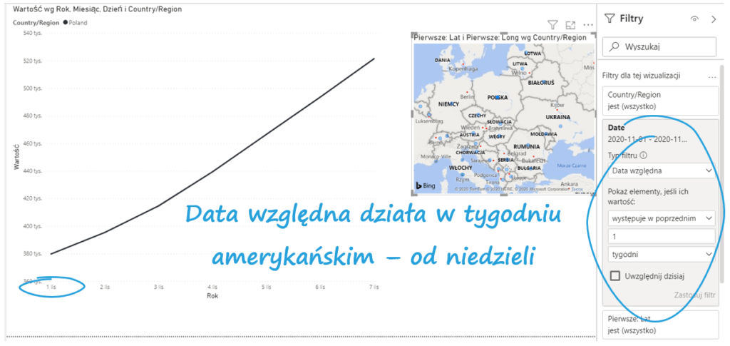 Uwaga! Początek tygodnia w filtrowaniu po Dacie względnej zaczyna się od niedzieli. Zobacz datę początkową na innym przykładzie – dziennej całkowitej liczbie chorych na COVID-19 – 1 listopada 2020 to niedziela.
