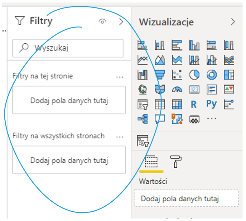 Drugą standardową formą filtrowania jest wykorzystanie panelu Filtry. Pozwala on na globalne ustawienie filtrowania: z góry odrzucenie możliwości wybrania konkretnych dat do suwaka, zastosowanie filtrowania na tylko tej stronie lub w całym raporcie. Filtry znajdują się po lewej od panelu Wizualizacje i są zwykle schowane przed użytkownikiem końcowym.