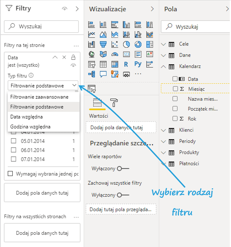 Przenoszenie kolumn z datami w odpowiednie półki pozwoli ustawić filtrowanie po datach na stronie lub w całym raporcie. Tu też możesz ustawić filtrowanie względne wybierając względną datę lub godzinę.