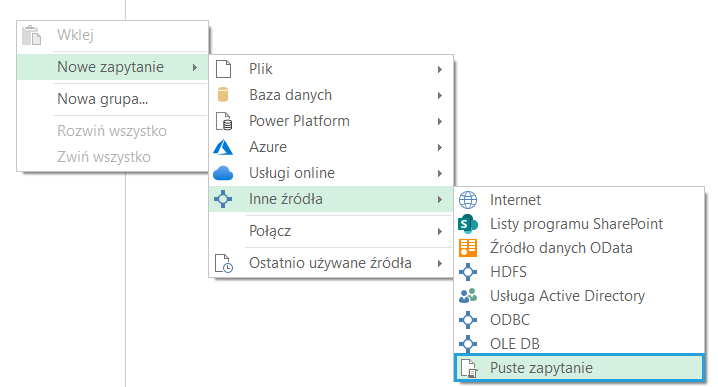 Aby utworzyć puste zapytanie, kliknij prawym przyciskiem w panelu zapytania, a następnie znajdź opcję Puste zapytanie.