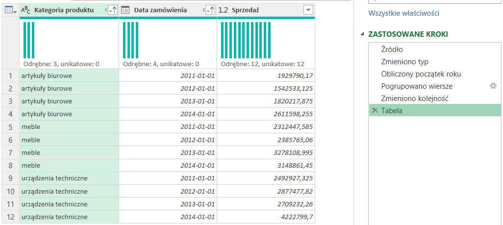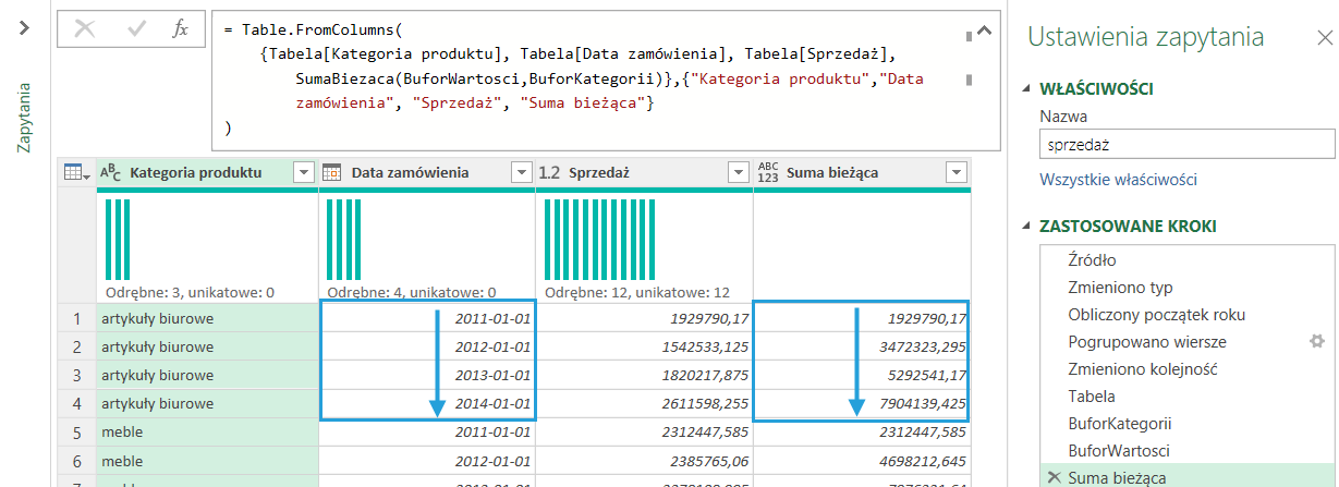 U mnie suma bieżąca ma być po latach. Dlatego sortuję tabelę po Kategorii produktu, a później po Dacie zamówienia. Dla ułatwienia nadaję ostatniemu krokowi w zapytaniu nazwę Tabela.