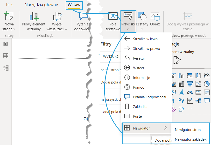 Nowa nawigacja została umieszczona na karcie Wstaw > Przyciski > Nawigator. Mamy do dyspozycji 2 opcje: strony i zakładki.