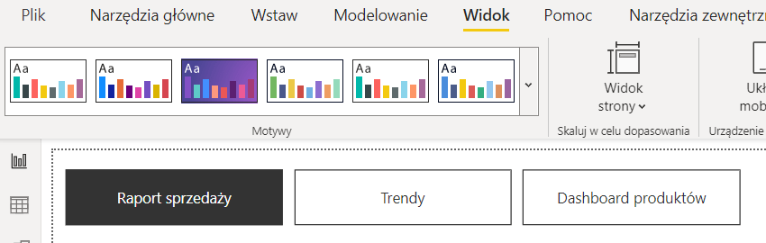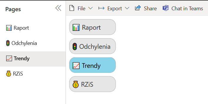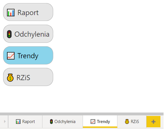 Możemy w nazwach Power BI posługiwać się wszystkim ikonami dostępnymi w zestawie UNICODE, czyli także emoji (skrót klawiszowy Windows + .). Zatem jeśli do nazw naszych stron w Power BI Desktop dołożymy ikony, możemy nawigację urozmaicić. Oto mój przykład dla 4 stron: