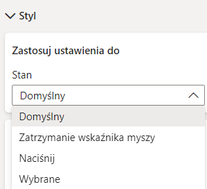 - Styl (czyli głównie czcionka, marginesy, obramowanie i kolory wypełnienia) w 4 stanach: Domyślny, Zatrzymanie wskaźnika myszy, Naciśnij, Wybrane.