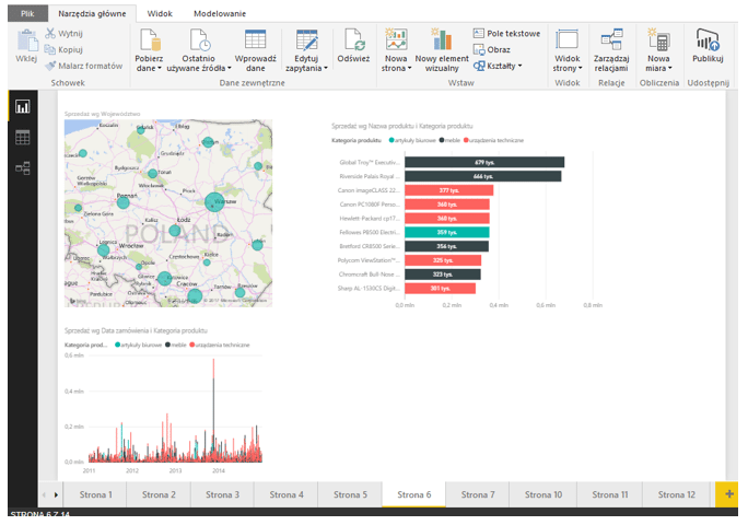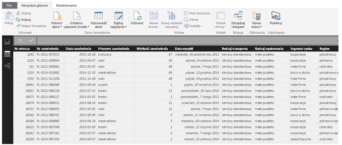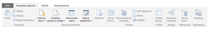1. Narzędzia Główne – opcje tu zamieszczone, pozwalają na pobranie danych, edytowanie ich, wstawianie elementów do raportu, tworzenia relacji, miar itd.