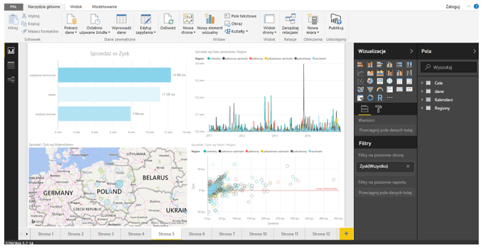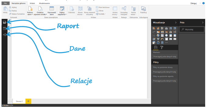 Obszar Pola pokazane są tu tabele użyte w raporcie/wizualizacji , tu również można zakładać filtry na danych. Zarówno pole Wizualizacje, jak Pola można zwinąć strzałkami po ich prawych stronach. Na dole okna widać dostępne strony w całym projekcie w Power BI.