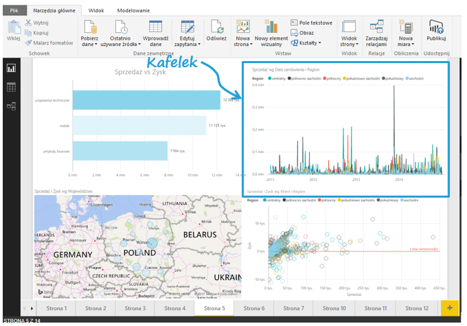 Kafelki (ang. tile) – pojedyncza wizualizacja znaleziona w raporcie lub dashboardzie. To prostokątne pudełko, które zawiera jedną wizualizację. Projektując raport czy dashboard mogę dowolnie przesuwać i ustawiać kafelki. W udostępnionych dokumentach nie jest możliwa zmiana aranżacji płytek czy ich rozmiarów.