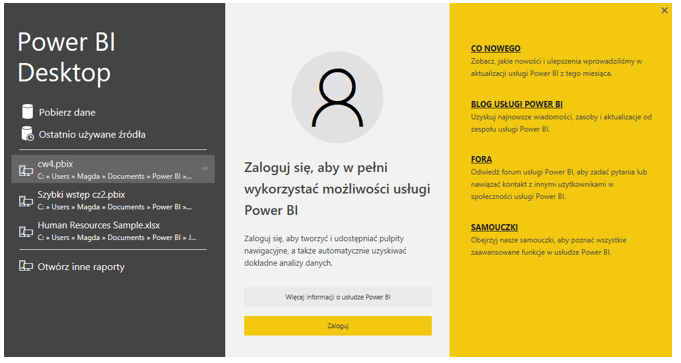 Poniżej widok powitalny, który pojawia się po uruchomieni narzędzia Power BI. Bezpośrednio z niego mogę pobrać dane (Get Data), zobaczyć ostatnio używane modele/projekty (Recent Sources) lub otworzyć zupełnie nowe dokumenty/raporty/pliki (Open Other Reports). Po prawej (na żółtym polu) widoczne są linki do stron Microsoft z pomocą dotyczącą narzędzia Power BI oraz dostępnych materiałów.
