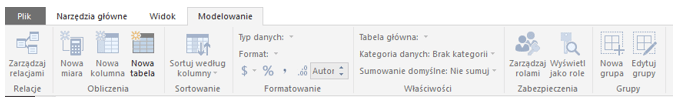 2. Modelowanie – pozwala na formatowanie danych, dodawanie miar, relacji, kolumn, tabel, sortowanie.