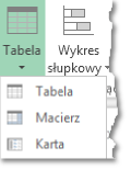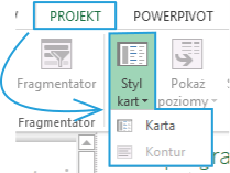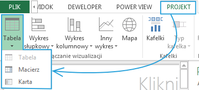 W PowerView mamy trzy gatunki tabel: tabela (to nie pomyłka: tabela dzieli się m.in. na tabelę) macierz, karty. Przełączanie pomiędzy poszczególnymi typami zachodzi przy pomocy zakładki Projekt -> Tabela: