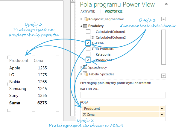 Tabelę można utworzyć na trzy sposoby: zaznaczyć checkbox koło nazw interesujących nas kolumn bądź miar, przeciągnąć je do obszaru POLA bądź też przeciągnąć je na obszar raportu.
