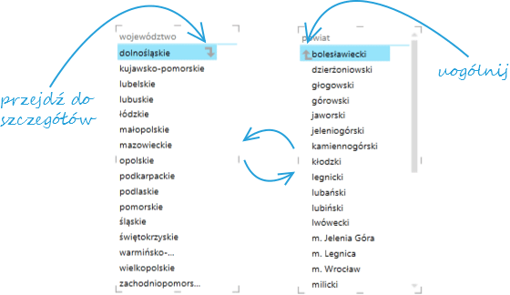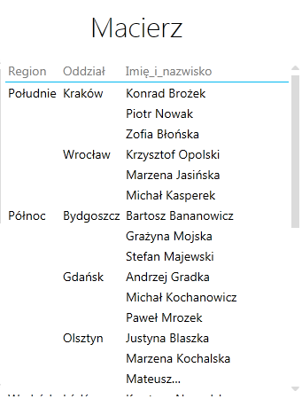 Można także zmienić nieco formę tego typu macierzy – wystarczy kliknąć Projekt -> Pokaż poziomy i zmienić jedną z istniejących tam opcji, np. wybrać Wiersze – włącz przechodzenie po jednym szczególe na raz. W efekcie będziemy mieli interaktywną tabelę, która będzie pokazywała jeden poziom (inaczej: jedną kolumnę w odniesieniu do pierwszego poprzedniego typu macierzy). Przełączanie pomiędzy poziomami odbywa się przy pomocy strzałek do złudzenia przypominających te z przycisku w górę znanego z Windosa XP i starszych:
