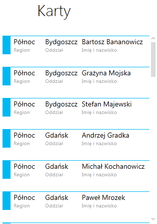 Karty, tak jak typ „tabela”, prezentują każdy wiersz jest osobno. Jednak są one nieco inne już w swym założeniu – są stworzone do prezentacji niewielkiej ilości danych w atrakcyjny i bardzo czytelny sposób. Ponadto bardzo dobrze nadają się do prezentacji grafik.
