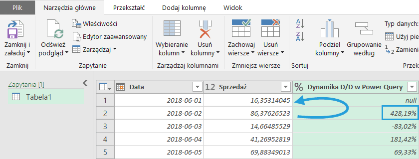 Jak obliczyć w Power Query różnicę pomiędzy wierszami?