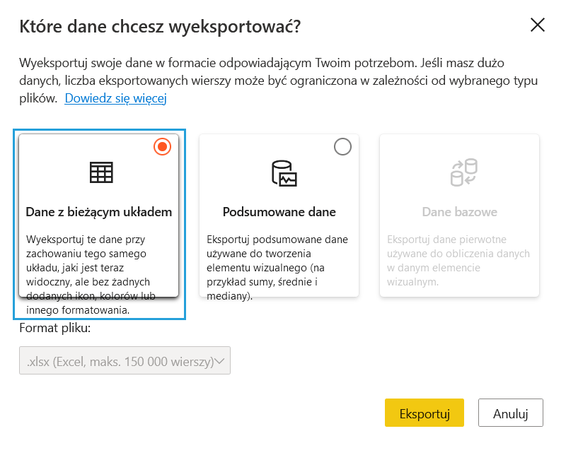 Eksportuj dane macierzy Power BI w bieżącym (widocznym) układzie graficznym