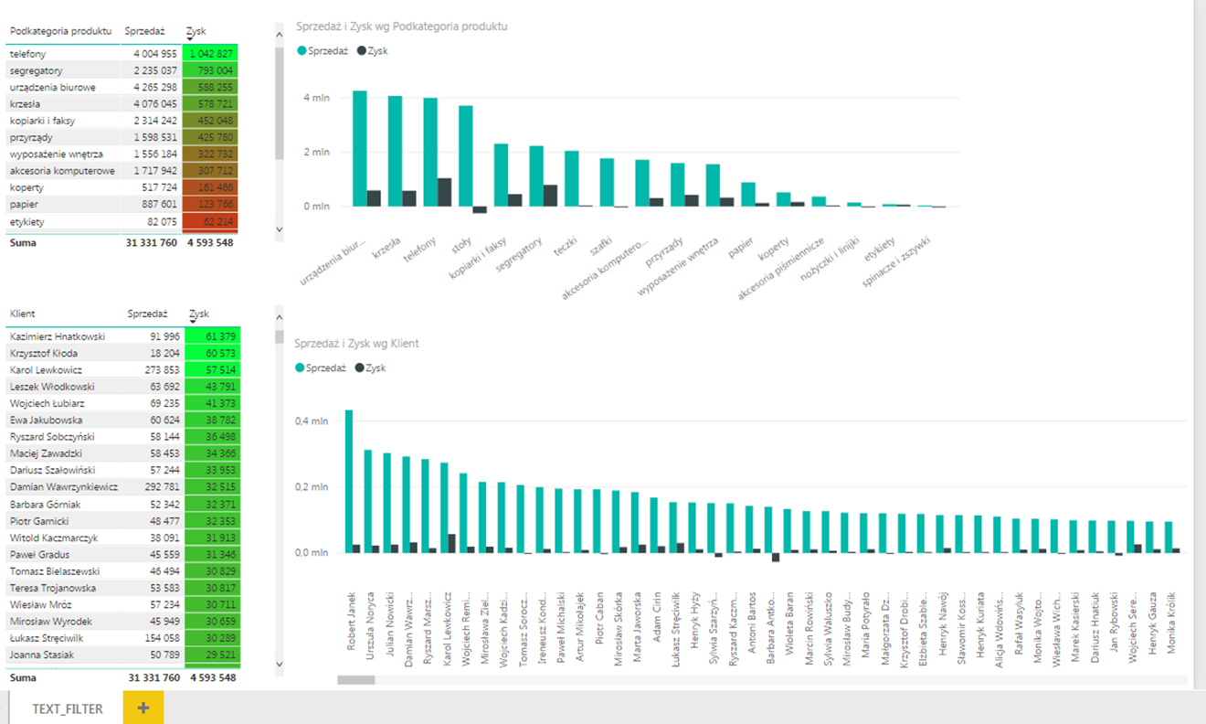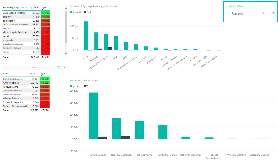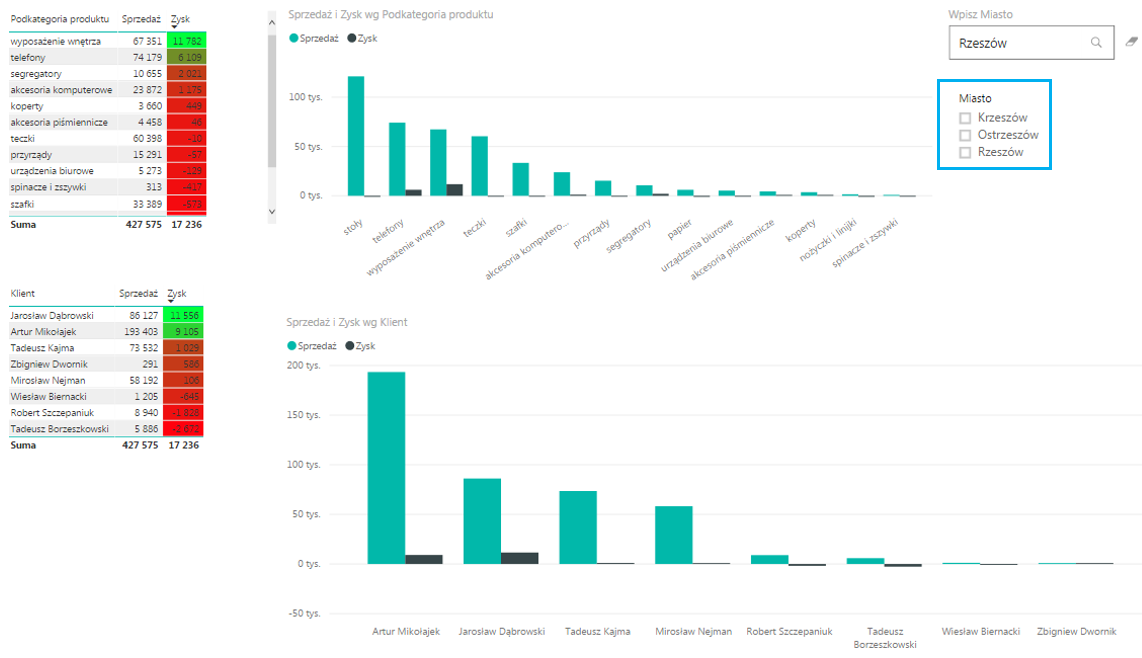 Od teraz możemy szybko i wygodnie wyfiltrować strukturę sprzedaży oraz zysku wg. Klientów i Podkategorii produktów w konkretnym mieście, np. aby sprawdzić strukturę sprzedaży dla Rzeszowa musimy w nowy Text Filter wpisać Rzeszów.
