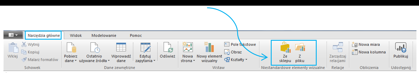 Na samym początku dodajemy Text Filter do okna Wizualizacji. Aby to zrobić wchodzimy w kartę Narzędzia główne następnie wybieramy z niej ikonkę Ze sklepu, która znajduje się w grupie Niestandardowe elementy wizualne.