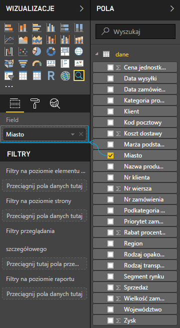 Na stronie widzimy dokładną strukturę sprzedaży oraz zysku. Jednak czy na pewno dla Rzeszowa? Cały czas musimy pamiętać, że Text Filter sprawdza ciąg znaków, to znaczy przefiltrował nasz dane o miasta, w których znajduje się ciąg znaków Rzeszów. Dołóżmy więc do stronyfFragmentator z pola Miasto, tak aby zobaczyć, jakie miasta zostały wybrane przez Text Filter.