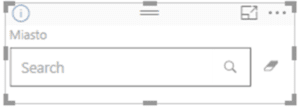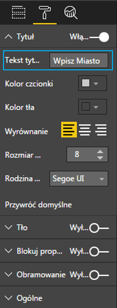 Zaznaczmy nasz Text Filter i wybierzmy opcję Format (jest to ikonka wałka malarskiego) z zakładki Wizualizację. Po wybraniu opcji Format rozwinie nam się lista z możliwościami edycji Text Filter’a. Zmieńmy tekst tytułu z Miasto na Wpisz Miasto. Dodatkowo w opcjach formatu możemy edytować wygląd Text Filter’a.