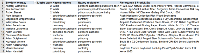 Analizując dane w tabeli przestawnej wyświetlającej wartość sprzedaży danych produktów w poszczególnych miesiącach doszliśmy do wniosku, że potrzebujemy aby dane wyświetlane dla miesięcy kwiecień, maj, czerwiec wyświetlały nam się jako jedna pozycja o nazwie II kwartał.