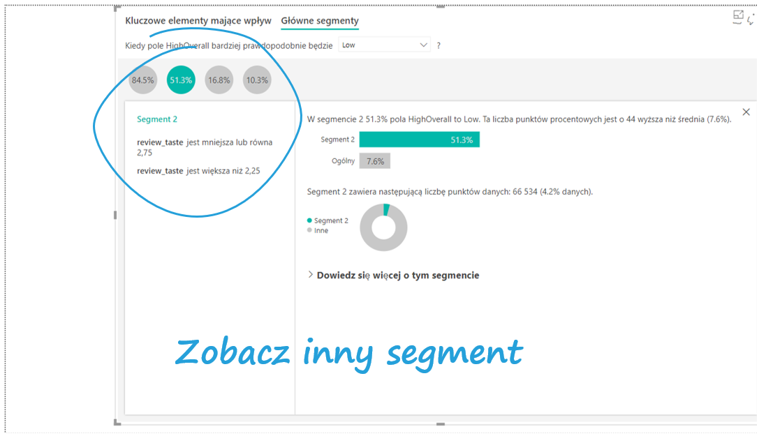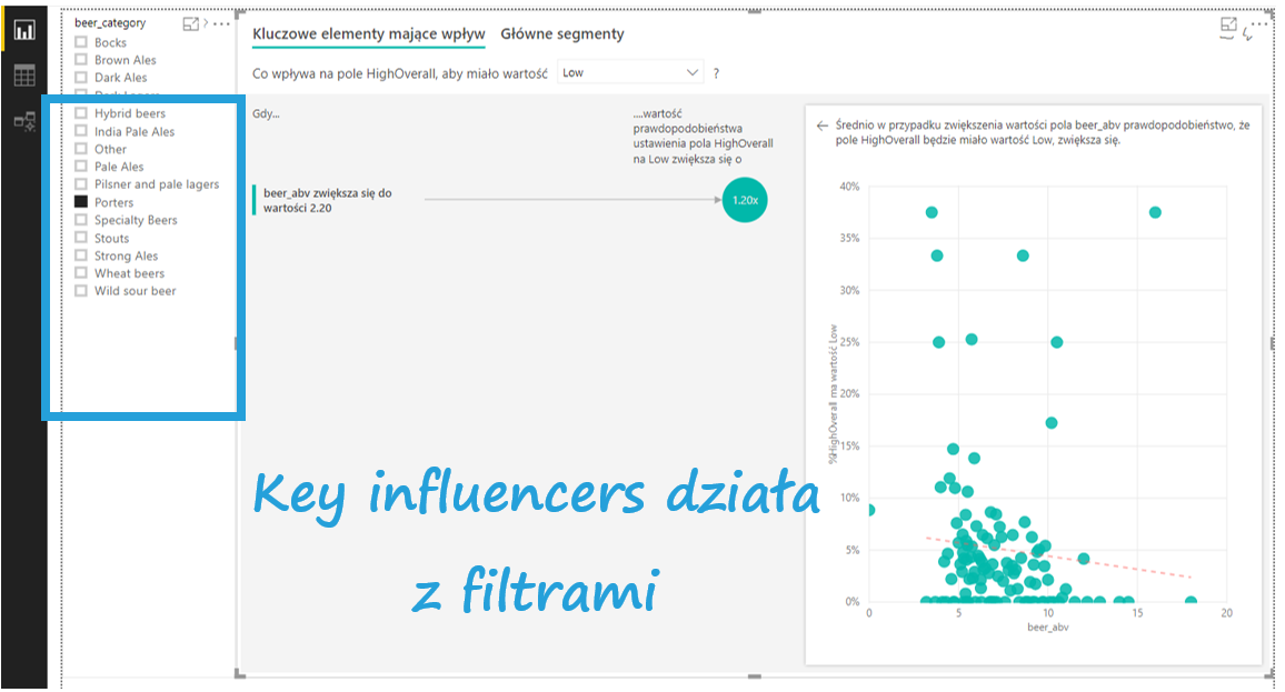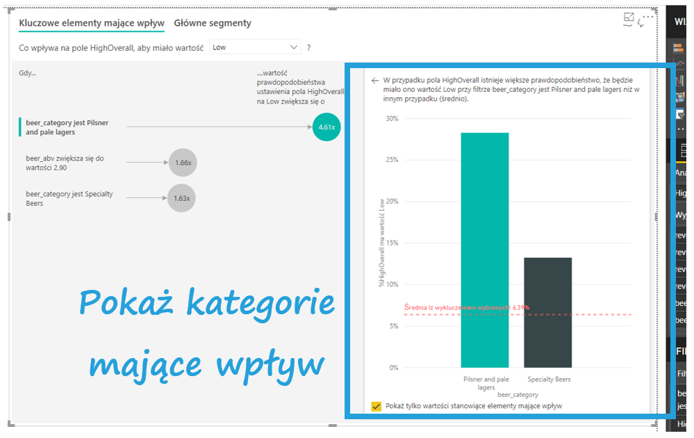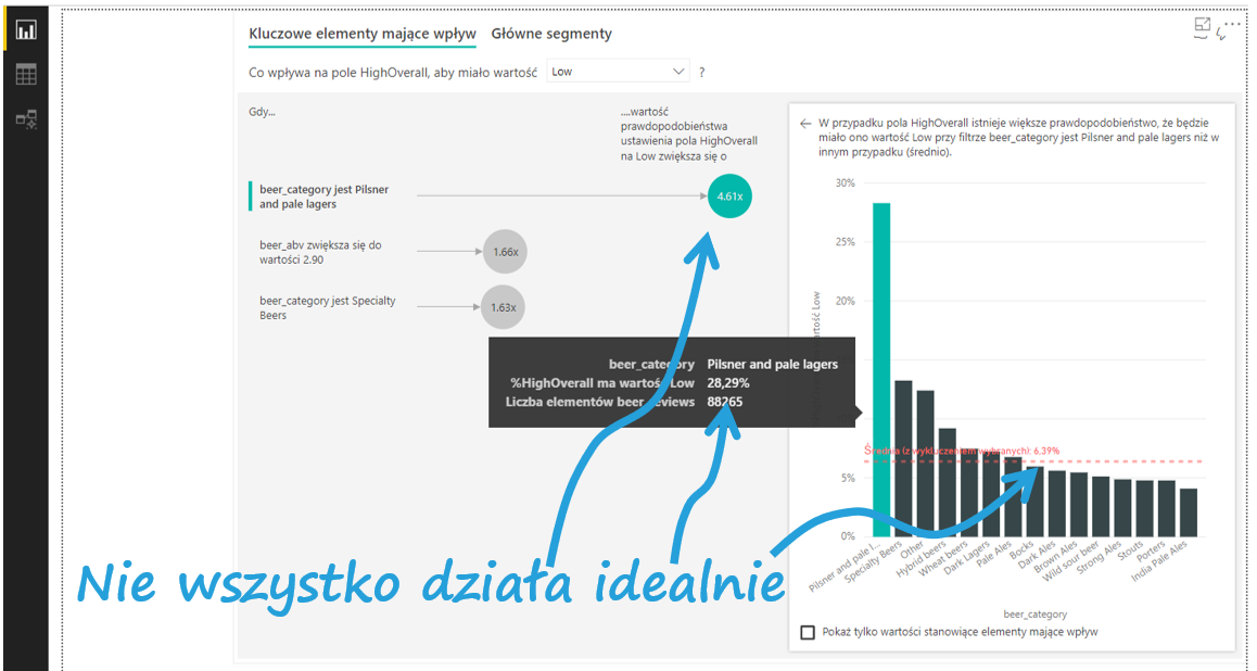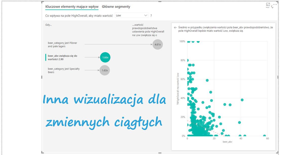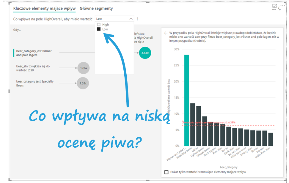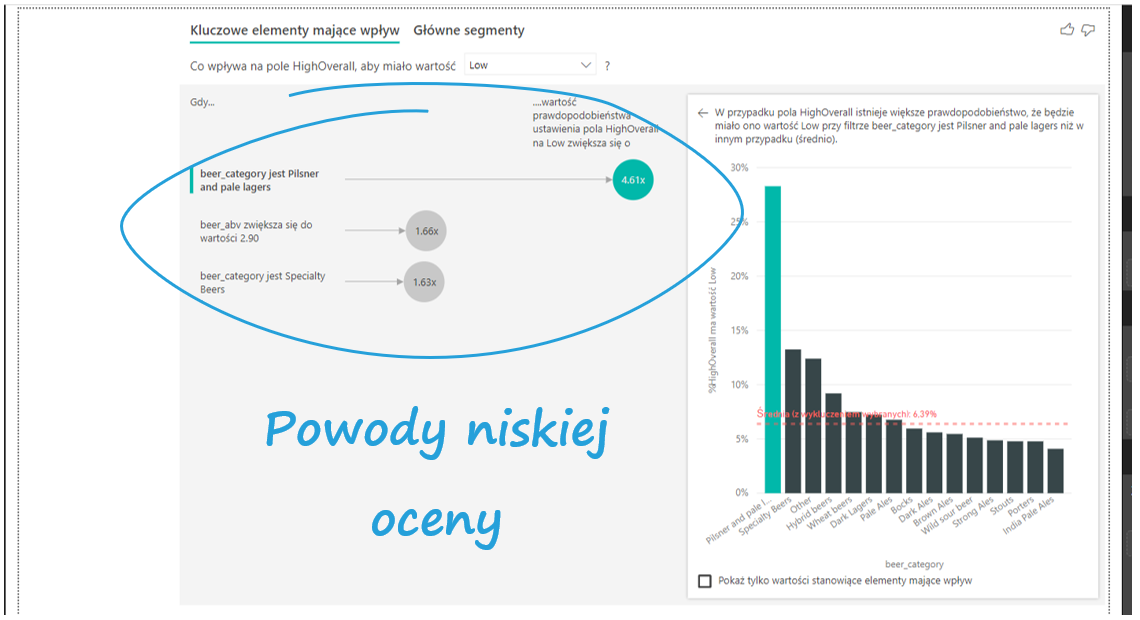 Na razie Power BI szuka najlepszych czynników, które powiedzą, dlaczego klient ocenił piwo wysoko. Możemy to zmienić na ocenę niską na wybieranej liście po lewej stronie grafiki.