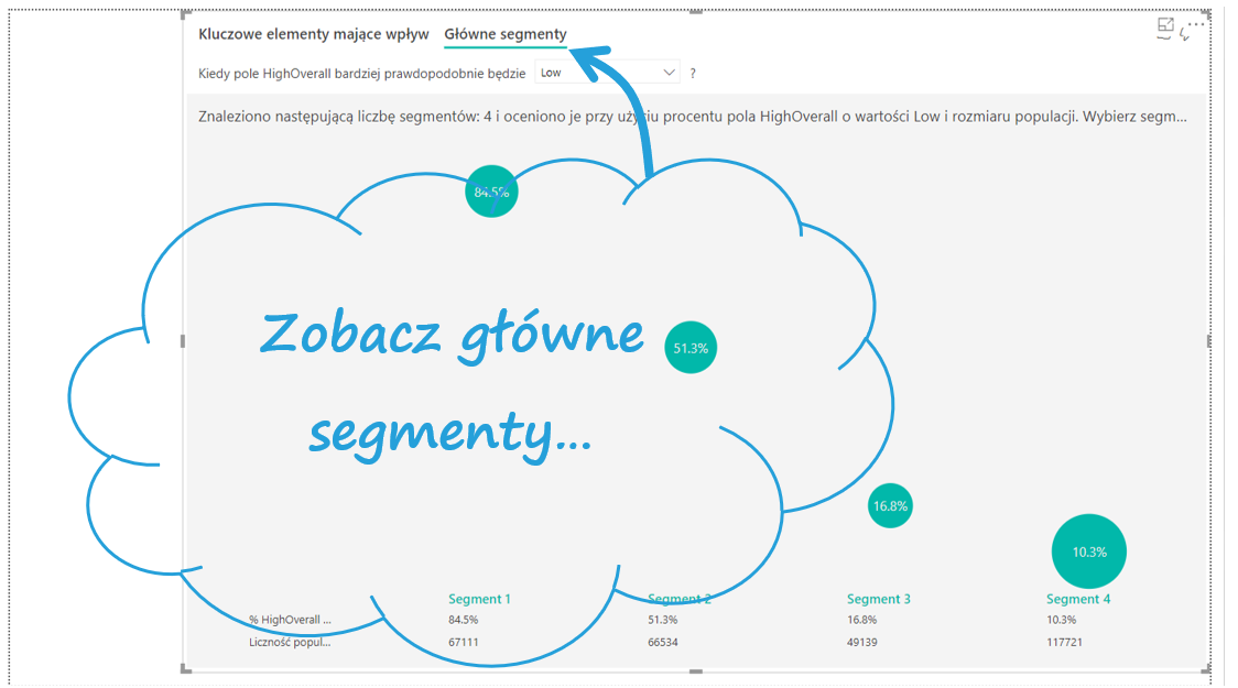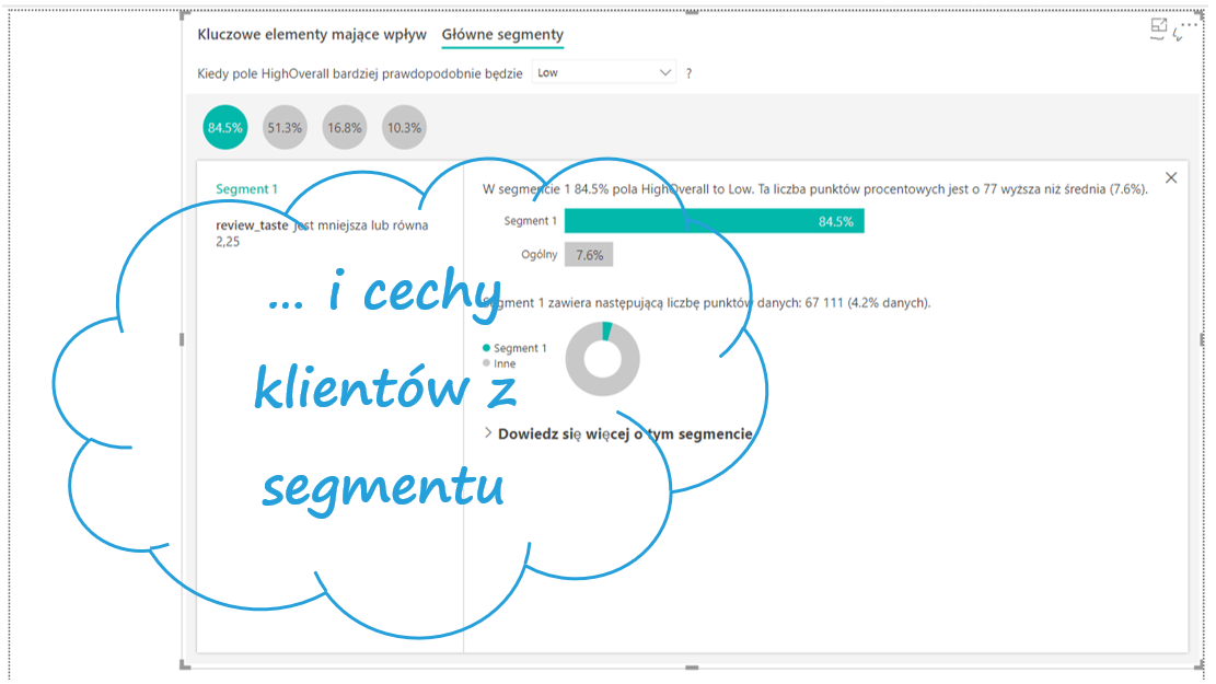 Power BI podzielił klientów na 4 grupy różniące się odsetkiem osób niezadowolonych. Wielkości bąbelków sugerują liczności poszczególnych grup. Gdy klikniemy na interesujący nas bąbelek, dowiemy się szczegółów o danym segmencie.