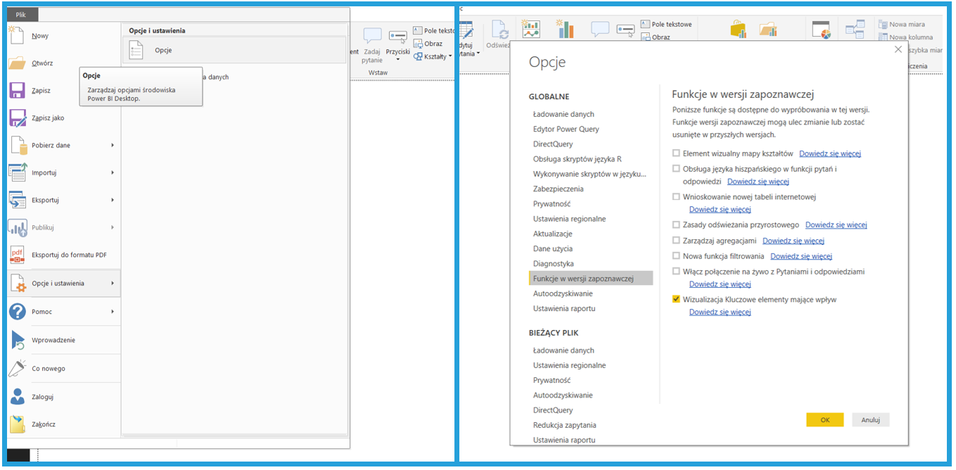 Przede wszystkim włącz opcję Key influencers. Jak każdy nowy dodatek typu preview, trzeba go włączyć ręcznie. Kliknij Plik > Opcje i ustawienia > Opcje > Funkcje w wersji zapoznawczej > Wizualizacja Kluczowe elementy mające wpływ, a następnie zatwierdź OK. Power BI się zrestartuje i przystąpimy do pracy.
