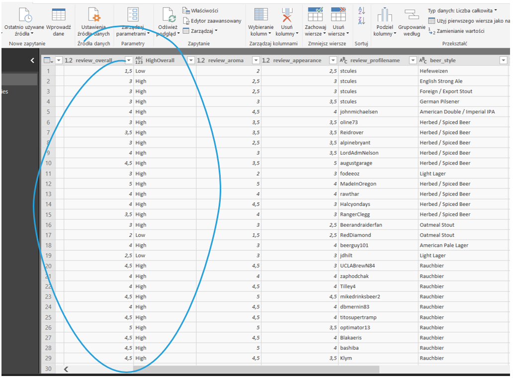 Następnie wgrywam dane: pobrane z data.world oraz ręcznie przygotowany słownik na podstawie zakładki Beers > Beer Styles na stronie BeerAdvocate. Niestety nie wszystkie kategorie piw są tu wyszczególnione, niektóre nazwy nie są dokładne, więc zastosowałem fuzzy merge (możecie o tym poczytać w tym artykule) przy domyślnym progu podobieństwa i zwracających maksymalnie 1 dopasowanie. Tam, gdzie jednak żadna kategoria się nie dopasowała, zamieniłem brak danych na kategorię Inne (Other). W kolejnym kroku na podstawie kolumny z ogólną oceną napoju tworzę kolumnę z informacją, czy ogólna ocena piwa była wysoka, czy niska (HighOverall). Jeśli użytkownik wystawił ocenę wyższą niż 3, piwo jest oceniane wysoko. Jeśli nie, nisko.