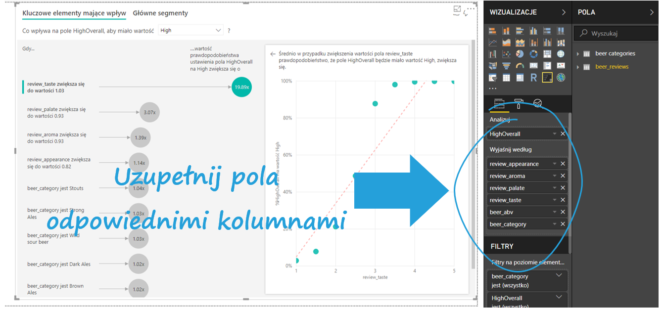 Pojawia się wizualizacja, a po prawej pola do uzupełnienia odpowiednimi kolumnami. Do okienka Analizuj przenoszę kolumnę HighOverall, a do Wyjaśnij według póki co wszystkie kolumny opisujące piwo. Power BI w locie analizuje zmienne i pokazuje te, które mają najsilniejszy wpływ.