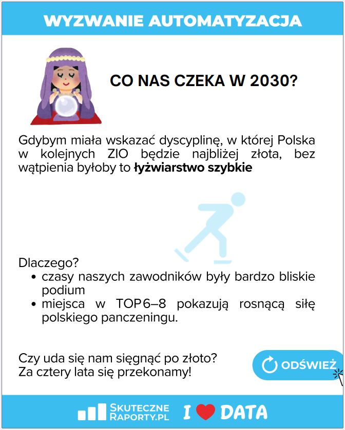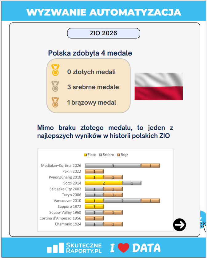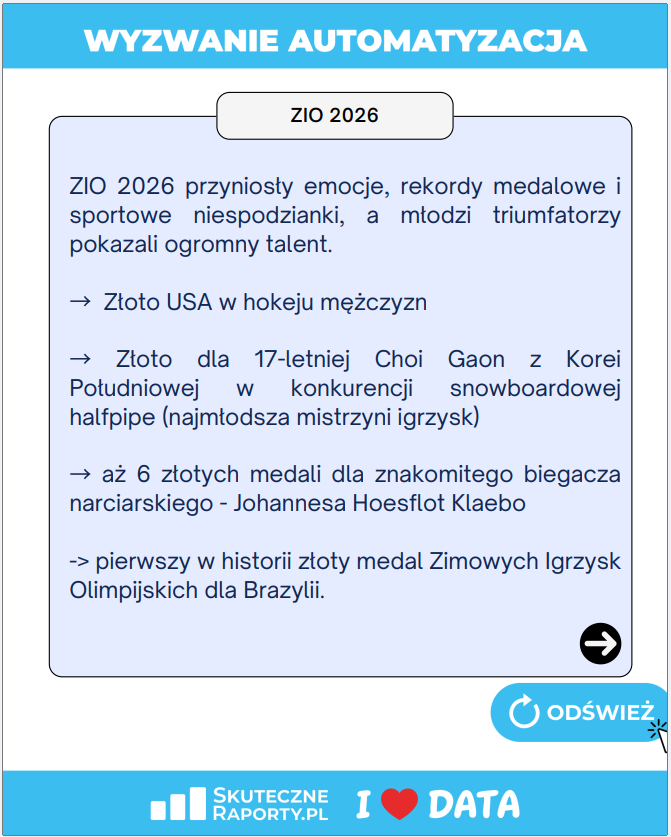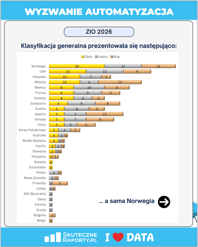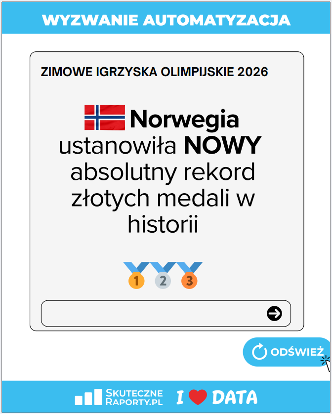 Huk startowego pistoletu usłyszeliśmy 19 lutego. Na starcie stanęło ponad 1700 zawodników, gotowych na morderczy sprint przez świat danych. Cel? Nie tylko meta, ale cyfrowy rekord świata w automatyzacji raportów. Dziś, gdy opadły już emocje, a sędziowie podliczyli punkty, czas na oficjalne podsumowanie analitycznych igrzysk #WyzwanieAutomatyzacja.