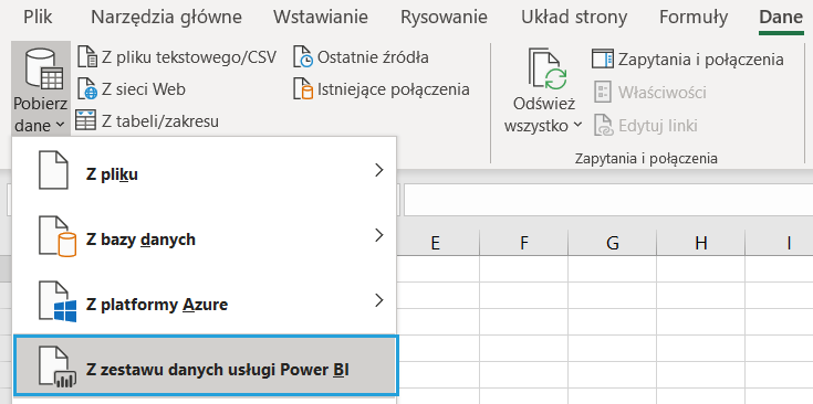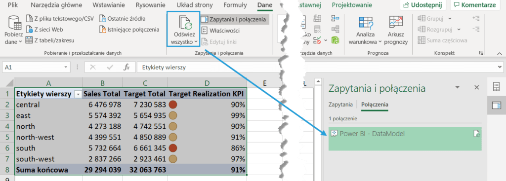 Sam plik nie przechowuje danych źródłowych, a jedynie połączenie do Power BI. Po ponownym otwarciu raport możemy odświeżyć tradycyjnie przyciskiem Odśwież wszystko na karcie Dane.