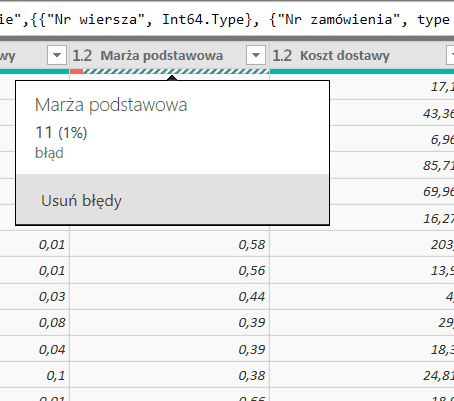 Funkcja pozwala na sprawdzenie błędów w kolumnach, sygnalizując stan zielonym paskiem. Jeśli pojawi się na nim czerwony fragment, oznacza to, że dane mają wartości puste lub błędne.