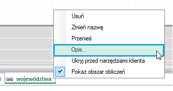 Taki opis można stworzyć z poziomu widoku danych, klikając prawym przyciskiem myszy na zakładkę z nazwą tabeli i wybierając opcję Opis…: