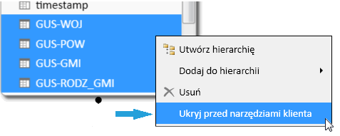 Ukrywanie całych tabel może odbyć się z widoku diagramu, bądź tez w widoku danych. W widoku diagramu wystarczy kliknąć prawym klawiszem na tytuł tabeli i wybrać opcję Ukryj przed narzędziami klienta: