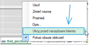 W widoku danych należy kliknąć prawym klawiszem na zakładkę z nazwą tabeli którą chcemy ukryć oraz wybrać, podobnie jak powyżej, opcję Ukryj przed narzędziami klienta:
