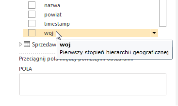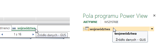 Wskutek powyższych działań zarówno na liście pól tabeli przestawnej, jak i na liście pól programu PowerView nie będą widoczne ukryte przez nas tabele oraz kolumny.