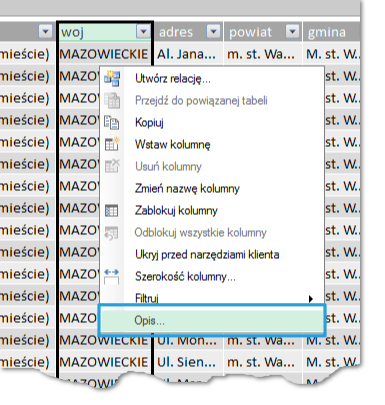 Aby stworzyć taki opis, wystarczy kliknąć w PowerPivot w widoku danych odpowiednią kolumnę prawym klawiszem myszy oraz wybrać opcję Opis…