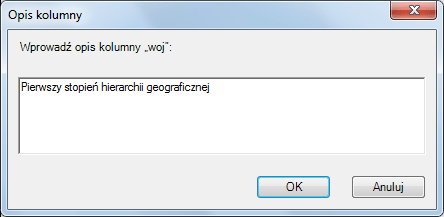 Pojawi się okno Opis kolumny, w którym wpisujemy komunikat jaki ma się wyświetlać po najechaniu kursorem na nazwę kolumny w liście pól programu PowerView: